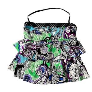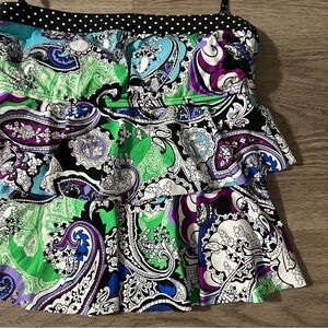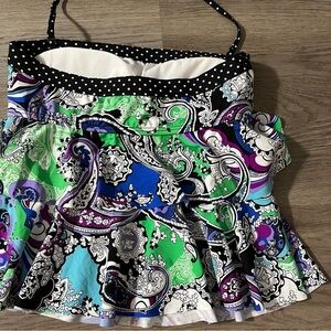 Kenneth Cole Tankini Ruffle Tiered Paisley Halter Strap Built in Bra Size Small. Polka dot lined. Green, blue and purple. See pictures for measurements