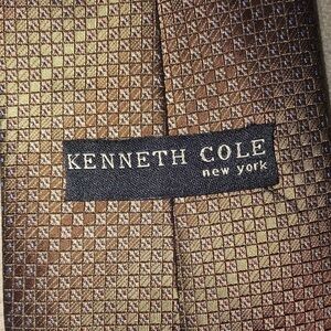 This Kenneth Cole tie is NWOT in a brown and gold toned diamond pattern with teeny blue centers.