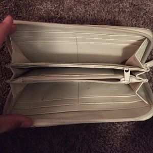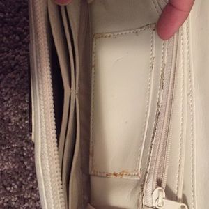Used/flawed Kenneth Cole wallet. No rips/tears but signs of wear. Off white/light cream color. Price reflects flaws