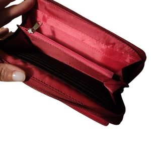 The wallet is red on the outside and pink on the inside.