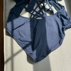 It includes a halter top with a tie around the neckline, and an additional tie at the mid-back for an adjustable fit.