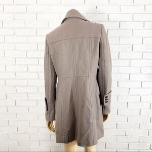 Walk out in style in this gently used commanding military look of a double-breasted coat tailored for a sharp fit in warm wool-blend jacket. 60% wool, 30% polyester and 10% rayon. Lined. Length 31”. Armpit to armpit measurement lying flat 20”.