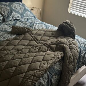 Stylish quilted puffer with a hood. Features front pockets and long length. Perfect for chilly days.