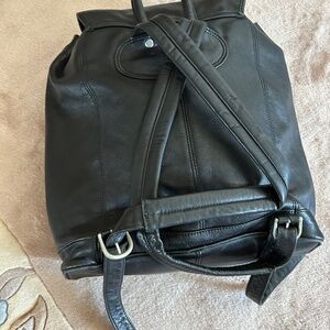 Black leather backpack with silver tone hardware. Very soft leather.