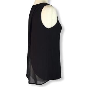 Kenneth Cole black chiffon back sleeveless round neck top in Excellent pre owned condition. Not just a basic jersey top, it has a surplice crossover back layered over sheer chiffon fabric, Washable Viscose spandex blend fabric, Slight high low hem. This versatile top can be worn casual over jeans, pants or shorts or dressed up under a blazer. Size XS but runs a little big. See actual measurements below.