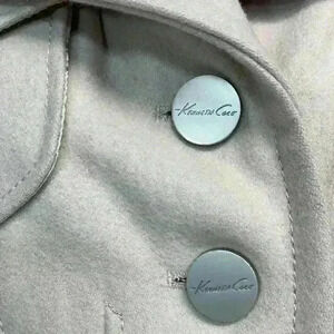 Kenneth Cole size 8 petite tan colored coat four buttons in the front large Kenneth Cole buttons to fake pockets on the bottom two real pockets on the top polyester lining needs to be dry cleaned as a little dirt on it but again the dry cleaning should take that out A14
