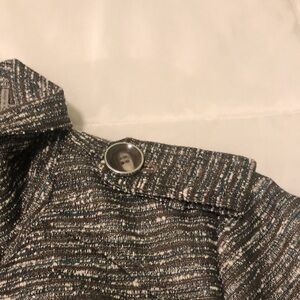 EUC trench coat form Kenneth Cole with decorative shell like buttons, shoulder epaulettes and neck buttons. Faux white part lining as shown and 2 front pockets. Colors of silver metallic and crams whites and turquoise. Dresses up any outfit.Buttons and belt have silver style color