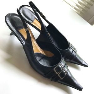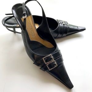 Wednesday Addams would totally wear these. Vintage early 1990's goth uber-pointy shoes! Leather upper, lining and sole. Two straps with silver buckles across front. 2" high "kitten-ish" heel. Made in Italy.