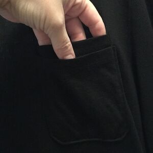 One smaller pocket within the main pocket on the front. Built-in “” patches on the back of the elbows. Kenneth Cole logoed rivets on the top of the shoulders. Super soft and super stretchy. Great looking with any color pair of denim slightly sheer so you might want to put a Cami underneath.