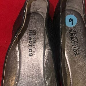 These Kenneth Cole Reaction flats feature a sleek black design with a shiny, patent-like finish. The intricate woven pattern and stylish pom-pom embellishments at the toe add a touch of elegance. Perfect for both casual and dressy occasions, these flats offer comfort and sophistication. Excellent condition!