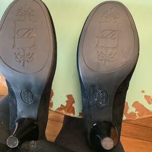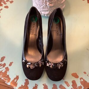 Black suede pumps with leather uppers and black gemstone accents. Very chic. Great condition. Heel height is 3.5”