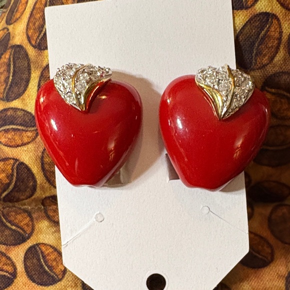 Kenneth J Lane KJL signed Vintage antique Red Heart enamel earrings w/ Gold