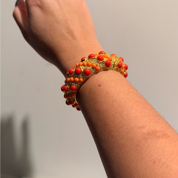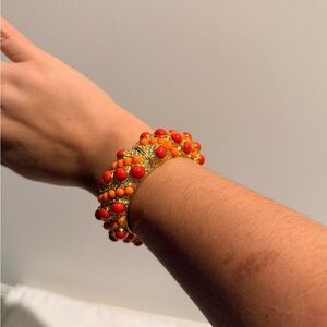 This stunning bracelet features vibrant orange beads set against a luxurious gold backdrop. Perfect for adding a pop of color to any outfit.