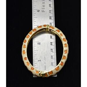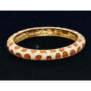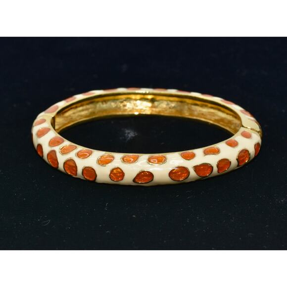 Channel your animal instincts with this giraffe inspired spring hinge bangle. This delicate bangle is gold plated and features white enamel with orange spots accents. Wear alone or layer for a stacked look.