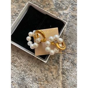 A ring of linked faux pearls suspend from these golden door knocker-style earrings.