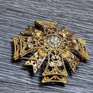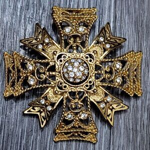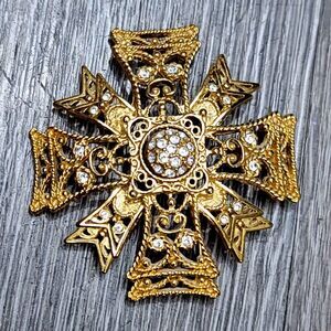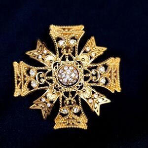 Add a touch of elegance to your outfit with this stunning Kenneth Jay Lane Maltese Cross brooch and/or pendant. Its excellent cut grade and beautiful round crystal main stone in white give it a timeless appeal. The bezel setting style adds to the beauty of this vintage piece, which is signed by the designer himself. The brooch and/or pendant is made of rhinestone and crystal materials with a gold color and an unknown base metal. The center rotates so you can wear it with the crystal side of the engraved design side.