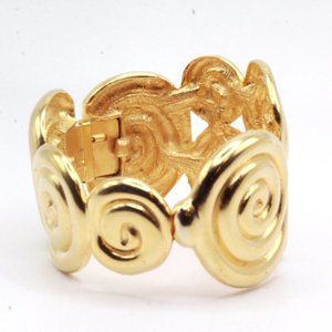 Introducing a true masterpiece by the legendary jewelry designer, Kenneth Lane. This Etruscan-inspired piece boasts massive swirls and intricate detailing in heavy gold plating, making it a classy addition to any outfit - whether it's for everyday wear or a special occasion. With an inside circumference of 6 1/2" and a width of 1 7/8", this stunning piece is sure to make a statement. The item is in pristine condition, and is marked with the iconic "KJL" signature, a testament to its designer's reputation for creating timeless and high-quality pieces. Made in the 80's, this is a must-have for any jewelry collector.
