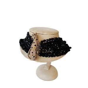 For sale is a rare beautiful signed Kenneth J Lane Duchess of Windsor Jet Black Torsade and Crystal Leopard Choker Necklace. Duchess of Windsor pieces were made between 1960-1980. This piece was created in the early 60’s. The necklace has some general light wear and is missing some crystals on the leopard but it is in overall great condition for its age. This is a gorgeous show stopping piece and looks amazing on.