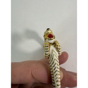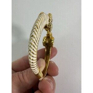 The Kenneth Jay Lane Enamel White Red Jeweled Double Ram Head Bracelet is a stunning piece of jewelry featuring an oval-shaped design with a multicolor enamel finish. The bracelet is made of gold tone metal and has a bangle style, making it a perfect accessory for all occasions. The unique double ram head charm adds an animal and insect theme to the piece, making it a standout accessory for any outfit. Made in China by the renowned Kenneth Jay Lane brand, this bracelet is a stylish and eye-catching addition to any jewelry collection.