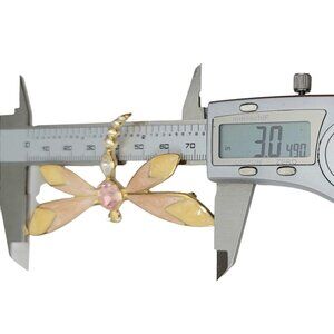 This Brooch Pin is one of a kind, It features a dragonfly figural pin in gold tone with pink cushion-cut rhinestones at the middle part, smaller navette clear rhinestones for the tail, and light pink enamel details on both wings. Marked K.J.L. For AVON on the reverse. There is some chipping on the stick pin on the reverse. The pin measures 1.6 inches tall and 3 inches at its widest and is finished with a strong locking pin at the back that functions properly.