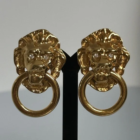 Elegant gold lion head earrings with sparkling accents. Perfect for a bold statement.