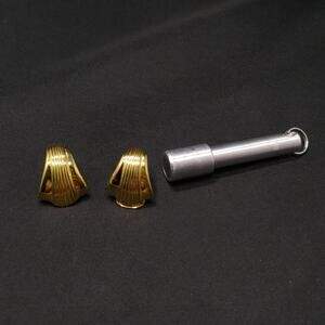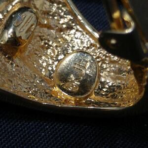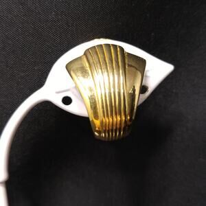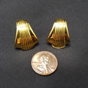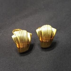 This is a beautiful pair of Kenneth Jay Lane (KJL) gold-plated clip-on earrings in a sculpted shell design from the 1990s. Each earring features a sleek, modernist curve with finely ridged detailing and a mirror-like finish that reflects light beautifully.