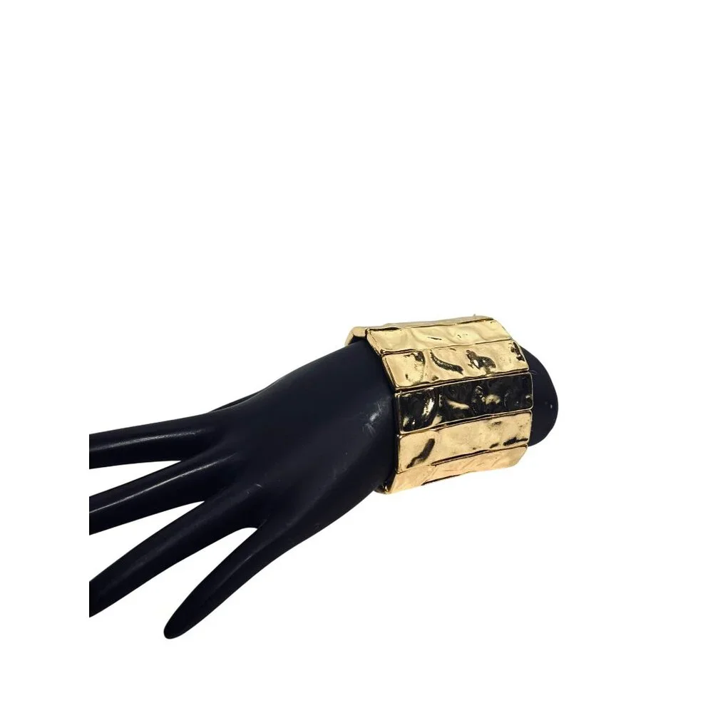 This Kenneth Jay Lane bracelet features a rich gold-tone hammered panel design with a stretch fit for comfort. A timeless piece for vintage-inspired accessorizing.
