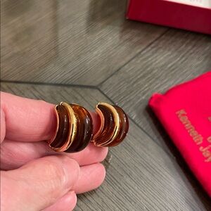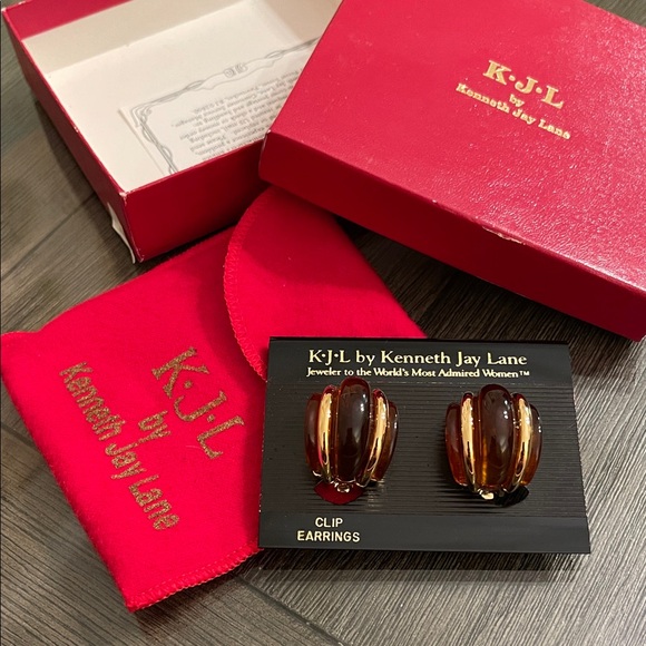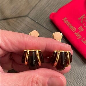 Chic clip earrings by Kenneth Jay Lane. Features a sleek gold-tone and brown design. Ideal for elevating any look.