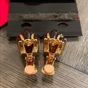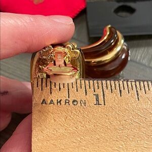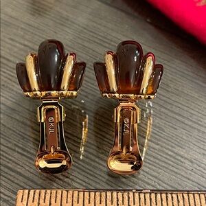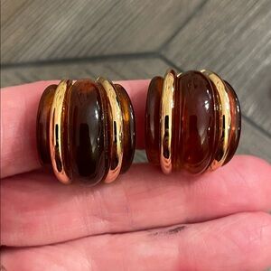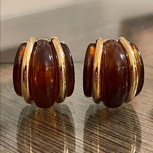 Gold-tone & Brown Acrylic Half Hoops - Huggies - Clip Earrings