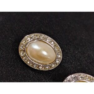Elegant vintage clip earrings by Kenneth Jay Lane (KJL) featuring oval faux pearl cabochons framed with sparkling rhinestones in a silver tone setting.