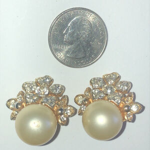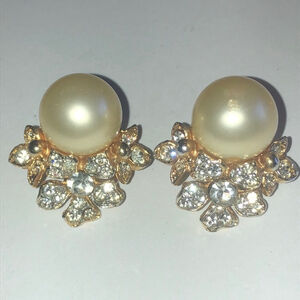 Kenneth Jay Lane KJL Vintage Gold Tone Faux Pearl CZ Rhinestone Clip On Earrings