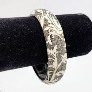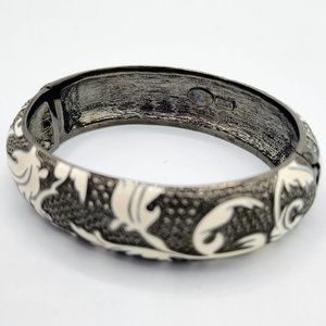 Kenneth Jay Lane KJL White Enameled Rhinestone Studded Black Tone Hinged Bangle