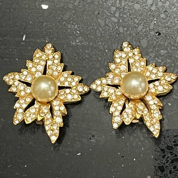 These spectacular KJL earrings are from the late 1990s They are big and bold featuring cream pearls surrounded by sparkling crystals in a floral design. They are in Lake new excellent condition, never worn.