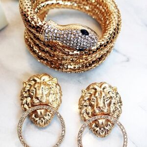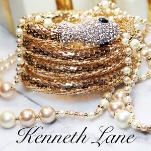 This exquisite Kenneth Jay Lane Serpent Bracelet is fascinating! It is dazzling and is designed with a beautiful, polished gold tone mesh forming the snake's body and has a sparkling, clear crystal encrusted snake head with black crystals to finish off the eyes. This piece will fit most wrists since it's adjstable meauring approx. 1"W x 9" diameter and wraps around the wrist three and half times. There is a Kenneth Lane Oval cartouche attached to the tail of this piece marking it's maker, Kenneth Lane. This elegant piece is super luxe, chic & luminous making it an excellent addition to your jewelry box or a decadent gift for your favorite Kenneth Jay Lane collector! This piece is sold with elegant tissue paper, gift box and gold jewelry pouch. Please let us know if you have any questions or would like additional photos. All reasonable offers accepted. Be sure to take a look at the other Kenneth Jay Lane jewelry available in our closet and boutique!