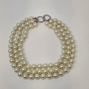 Kenneth Jay Lane Triple Strand Cream Faux Pearl Necklace Crystal Hook Clasp