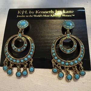 Amazing turquoise and gold tone dangle chandelier earrings by designer Kenneth Jay Lane KJL on original card. I can put in gift box if requested. About 1 7/8” long by 1” wide.