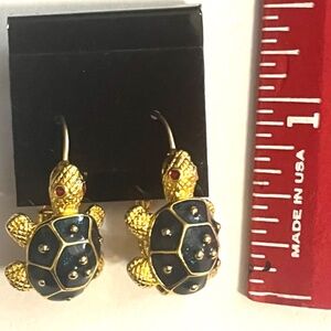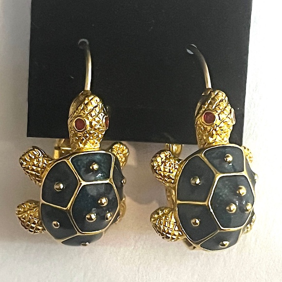 Kenneth Jay Lane Turtle Earrings. Enameled dark green with red eyes,