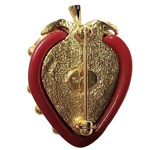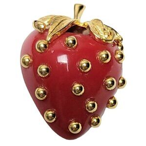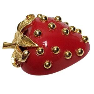 Chic, glamorous, and fun red lucite strawberry with gold-tone seeds and top brooch by Kenneth Jay Lane. Signed KJL on reverse. Measure approximately 1.3-inch high. The pin functions properly and is in good vintage condition.