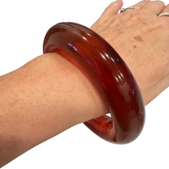 Elegant vintage bangle by Kenneth Lane, featuring a rich, reddish-brown hue!The bangle has a subtle depth of color, ranging from deep red to warmer amber tones. A small, gold-tone plaque bearing the Kenneth Lane name is in the inner surface, marking its designer origin and adding a touch of discreet branding. From the 80's!