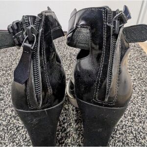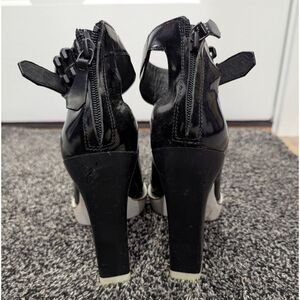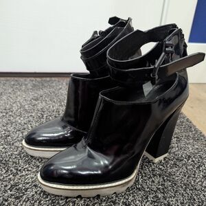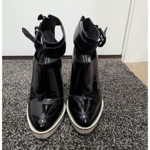 Kenneth Cole New York "Otto" boots featuring a glossy black patent leather upper paired with a contrasting white platform sole. The substantial heel adds height and elegance, while the ankle strap detail offers a modern touch with some edge! Perfect for adding a chic edge to any outfit, these boots seamlessly blend dressy and casual elements.