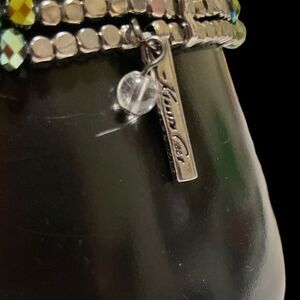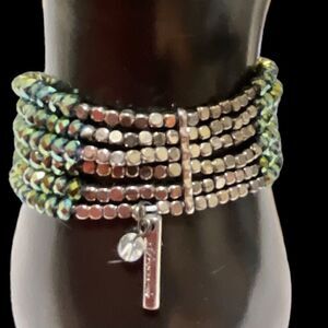 Gorgeous iridescent faceted beaded Kenneth Cole Stretch bracelet with beautiful peacock colored faceted cut crystal Rondelle beads and silver beads in 6 rows with a signature Kenneth Cole  bead Charm. Absolutely beautiful bracelet.