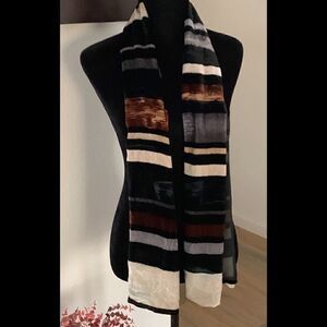 Scarf with beautiful Black, brown, grey and tan. 82” rayon 18” silk. Feels like velvet. Keeps you warm without being too heavy. Some panels on it are opaque, others are velvety. NWOT