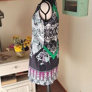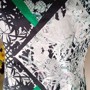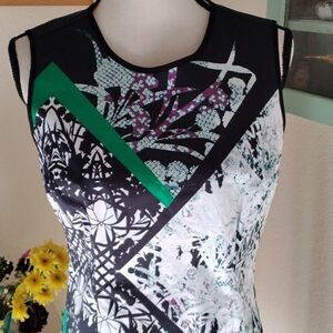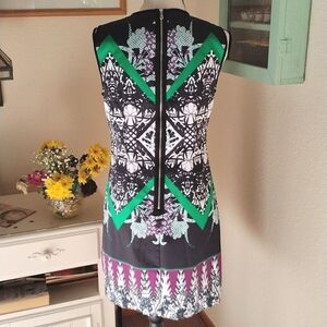 Great graphics, bold and bright. Fitted with seams. Exposed back zip. Fully lined. Size 8 measures 37 at chest, 32 at waist, 40 at hips, 34 long from shoulder to hem. This one will make you smile.