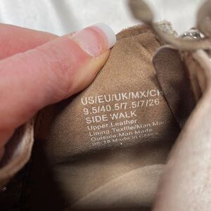 Kenneth Cole Reaction Side Walk Leather Booties. Size 9.5. Suede constructed ankle bootie. Back zip closure. Color: cloud/taupe. Stacked block heel. Almond toe. All over perforated detail. Grip sole. Excellent used condition.