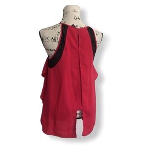 Kenneth Cole Pink sleeveless top. Ruffled sides. Black Mesh detailing near arm holes. Draped back.