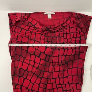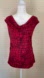 Red and black accent print throughout, lightweight, with drape front neckline.