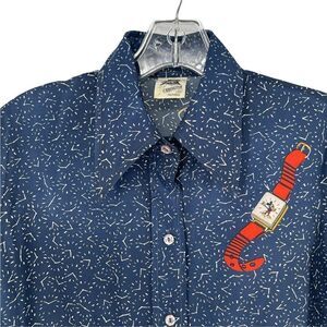Kennington California Disney Vintage 70s Shirt Mickey Mouse Watch Pattern Navy Blue Button Up Casual Shirt