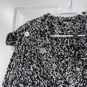 Kenneth Cole black and white knit sweater with large hidden snaps down the front. It is a lovely cardigan style sweater that is heavy enough to be a fall jacket. It is an acrylic blend with 15% wool. It has a high color and pockets and feels soft and warm.