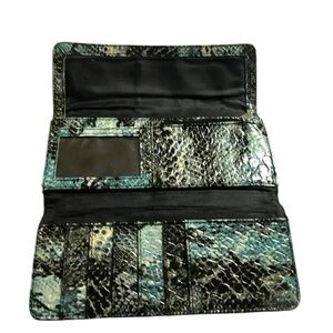 Aqua blue, black and cream long wallet. Magnetic snap. 7 credit card slots & coin pouch. Also includes ID holder