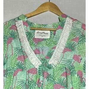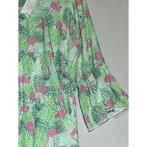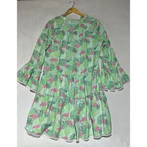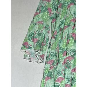 Kenny Flowers Sunshine State Flamingo Dress Medium Green Pink High Low V Neck Resort Wear Travel Beach Tropical Tiered Bell Sleeve Flowy